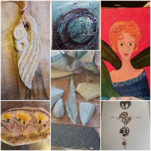 Come on in and have a look at the art. There are a range of woodblock prints, mixed media, carving, and fibre & fabric.