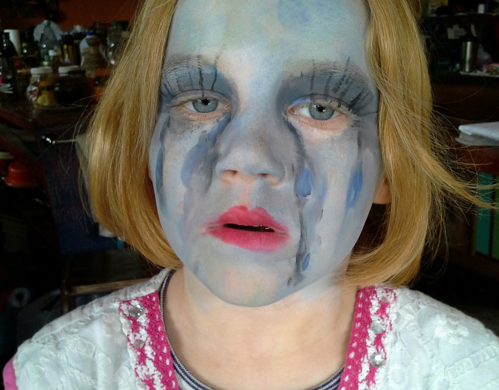 Most kids are happy with dressing up in a sheet for a kids ghost themed birthday party. I get to decorate mine properly. Pieces of art. They think of an idea and a back story and I get to create it. I love paint. I love painting on skin. At a party with sheet ghosts and skeleton shirts we have contributed a bride that drowned on the way to her wedding, a demon, and a radioactive burn victim.