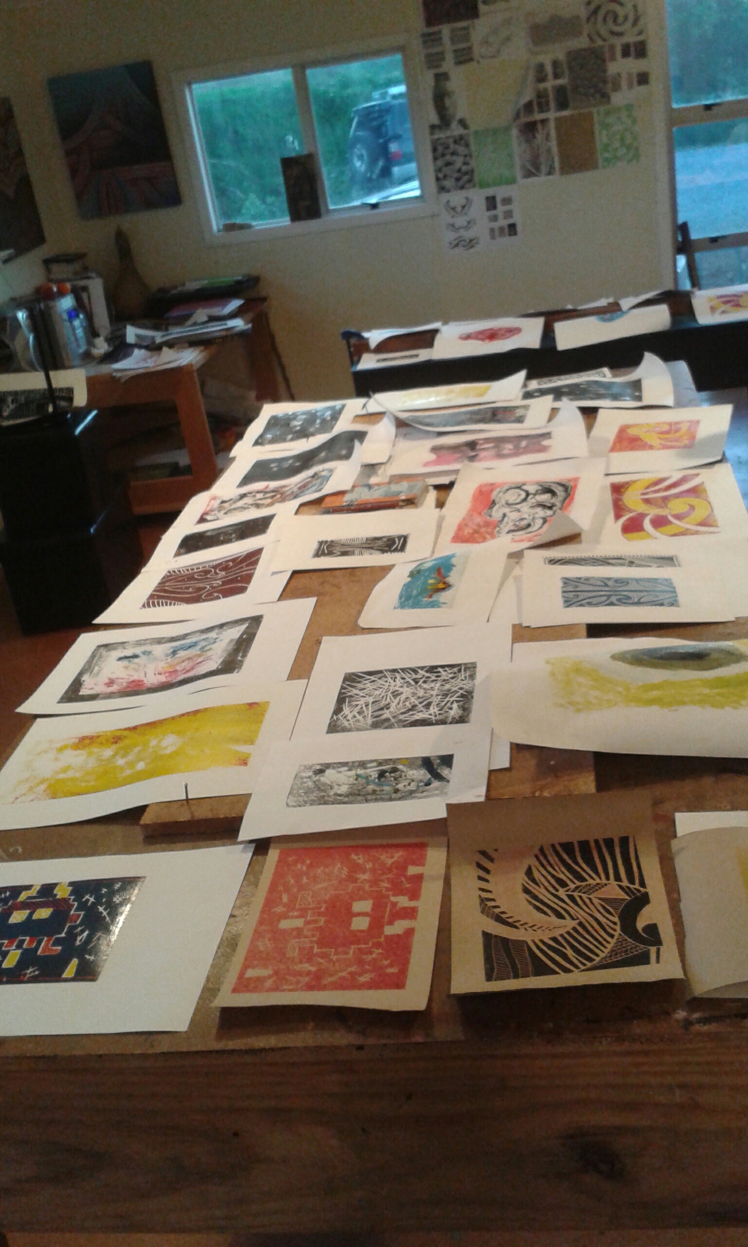 It’s amazing how much work can be produced when a group of 7 artists and 3 little kids get together for a day of playing at being printmakers. We have decided to get together to have fun, learn new skills, and produce beautiful artwork. A really great idea as it turns out.